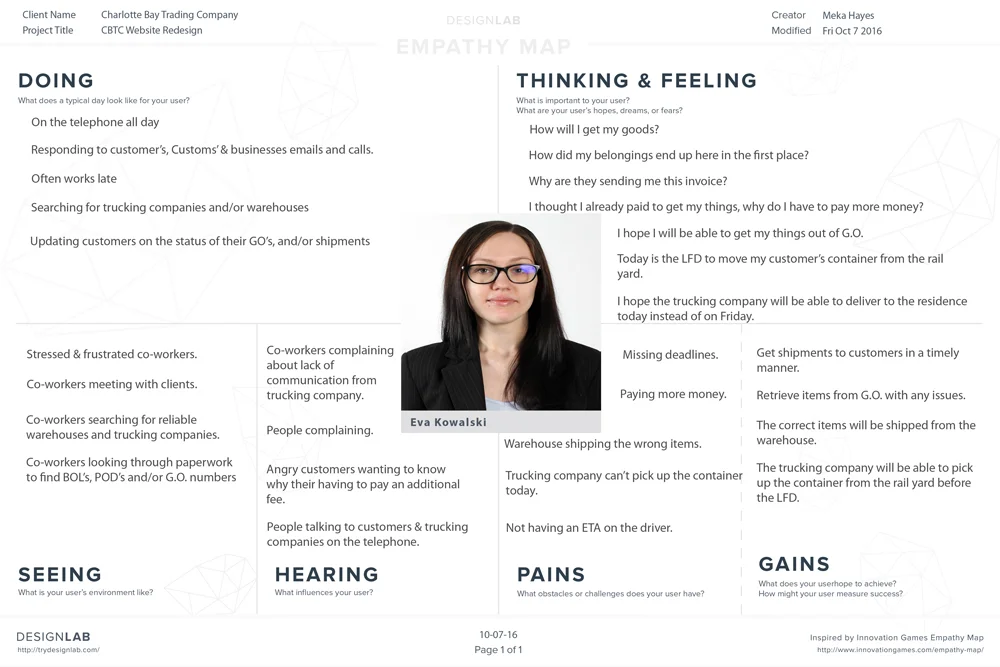 In creating this Empathy Map for Eva, I thought about what a typical day would look like for her; noting her environment, emotions, influences, etc. I listed the things I felt were important to her, the challenges she would face, and what she hopes to achieve.