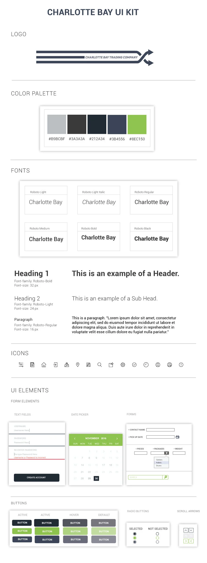 For this project, I looked at other UI designs and it inspired me to add a more polished simplicity to my UI kit. Both the client and myself, thought this color scheme conveyed a mature and professional look that the company was looking for.