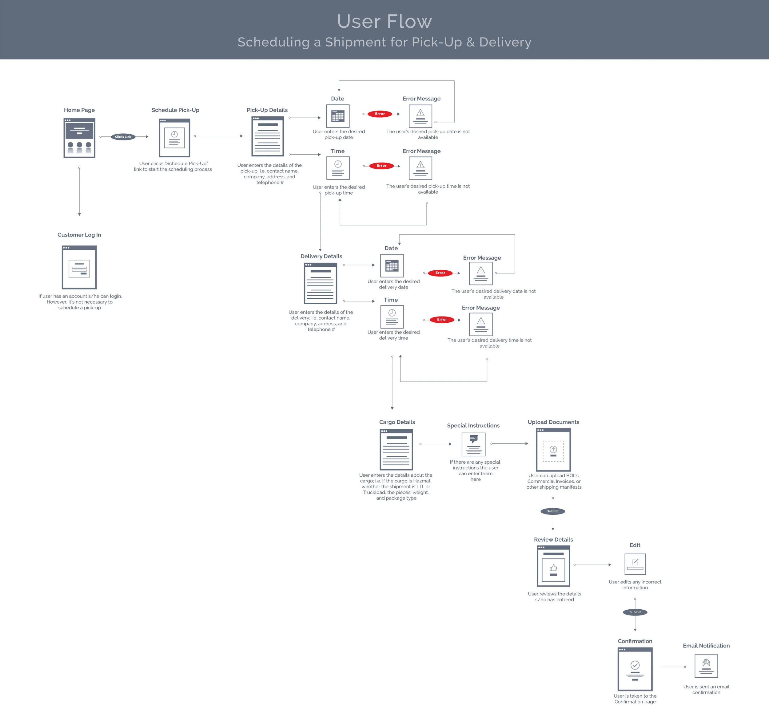 I created a user flow chart of the desktop/browser wireframes and included annotations. The chart shows the process a user would go through when scheduling a pick-up and delivery of goods.