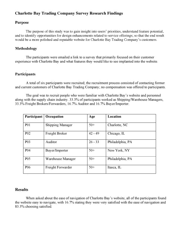 After going through my survey answers, I complied my research findings into a report. Current and former customers were asked to take the survey; the results revealed that some of the features Charlotte Bay's customer's were interested in seeing, were online inventory and shipment tracking, along with rate quotes, just to name a few items.