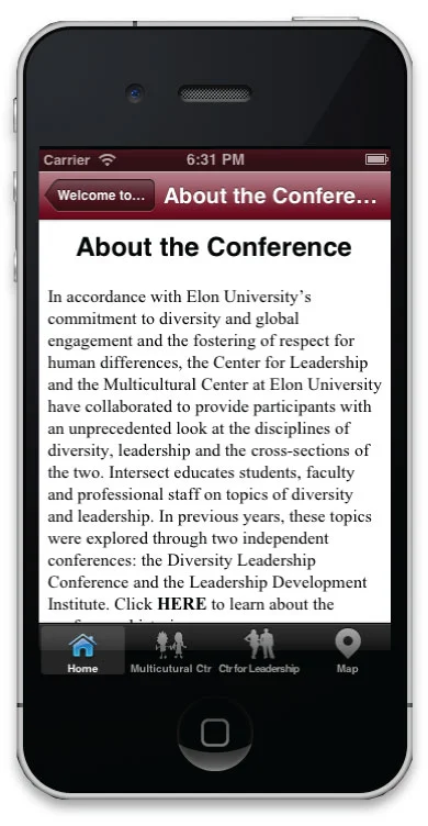 This was my very first freelance project since graduating from Elon University. I was tasked by the Director of the Multicultural Center with creating an app for Elon University's Multicultural Center's annual diversity conference, INTERSECT. I must admit I was extremely nervous about doing this job. I didn't want to seem like I was completely lost (though I was), but I wanted to do a good job and deliver a user-friendly app that would serve the purpose the Director wanted it to serve; deliver an app that would allow the students to register for the event on the go and that would also allow them to be update on who the speakers were, the event organizers and to view the conference agenda.